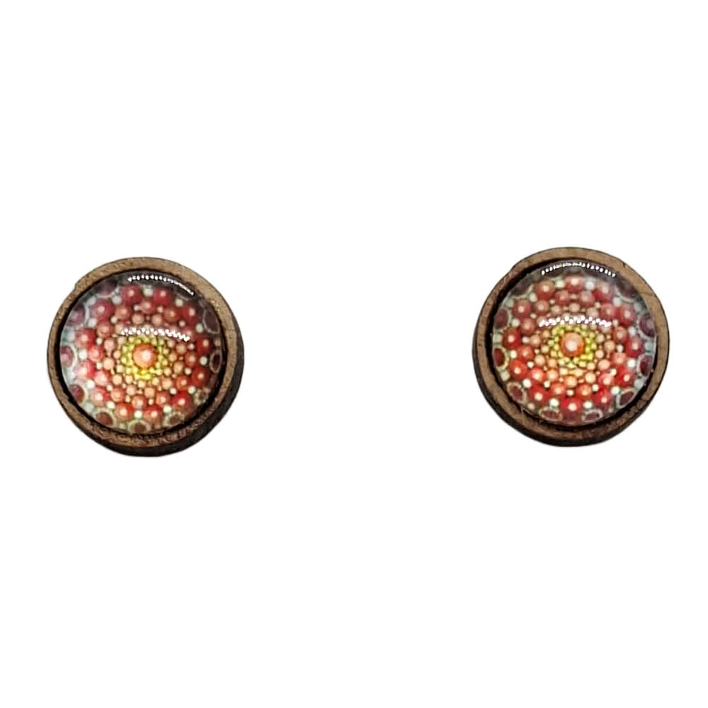 Središče uhanov krasi dinamičen vzorec v rdeči in rumeni barvi, ki simbolizira energijo, optimizem in toplino. Ročno poslikani detajli naredijo vsak par unikaten in poseben, saj se vzorec rahlo razlikuje od para do para. Les je zaščiten s premazom, ki ohranja barve žive in površino gladko. Kovinski deli so hipoalergeni, zato so primerni tudi za občutljivo kožo.