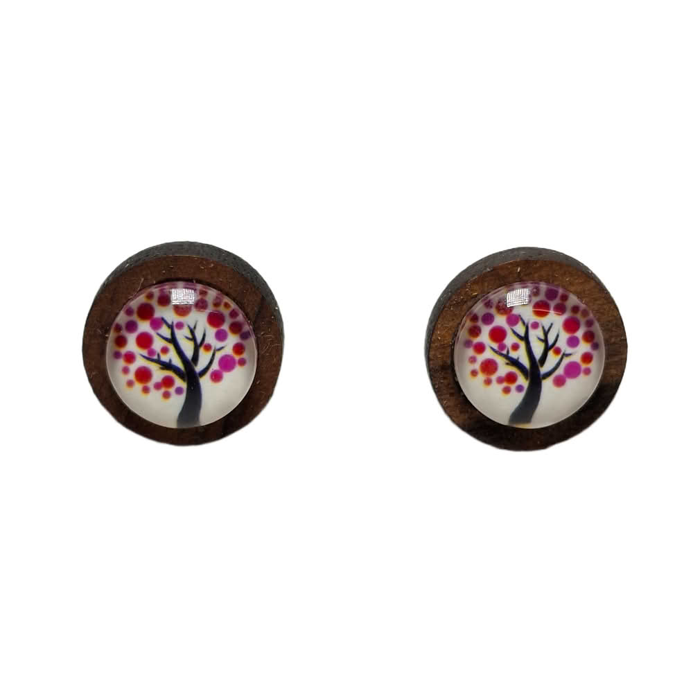 Središče uhanov krasi motiv roza drevesa, ki simbolizira rast, nežnost in ljubezen. Ročno poslikani detajli naredijo vsak par unikaten in poseben. Roza barva drevesa prinaša občutek topline in igrivosti, medtem ko naravni les poudarja pristnost in naravno estetiko. Les je zaščiten s premazom, ki ohranja barvo živo in površino gladko. Kovinski deli so hipoalergeni, zato so primerni tudi za občutljivo kožo.